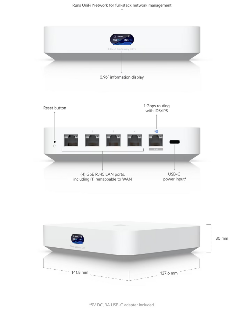 Ubiquiti UniFi – Router – Inalámbrico – Material de la carcasa: Policarbonato – Interfaz de gestión: Ethernet Bluetooth – Interfaz de red LAN: (1) puerto GbE RJ45 – WAN: (1) puerto GbE RJ45 – Método de alimentación: USB tipo C (5 V CC/3A) – MIMO: 2,4 GHz/ 5 GHz 2 x 2 (DL/UL MU-MIMO) 2 x 2 (DL/UL MU-MIMO) – Tasa de rendimiento: 2,4 GHz 5 GHz 573,5 Mbps 2,4 Gbps – Ganancia de antena: 2.4 GHz 5 GHz 4 dBi 5.15 dBi – Antenas: (2) Antena interna de doble banda WiFi 2.4G/5G (1) Antena BT interna 2.4G m